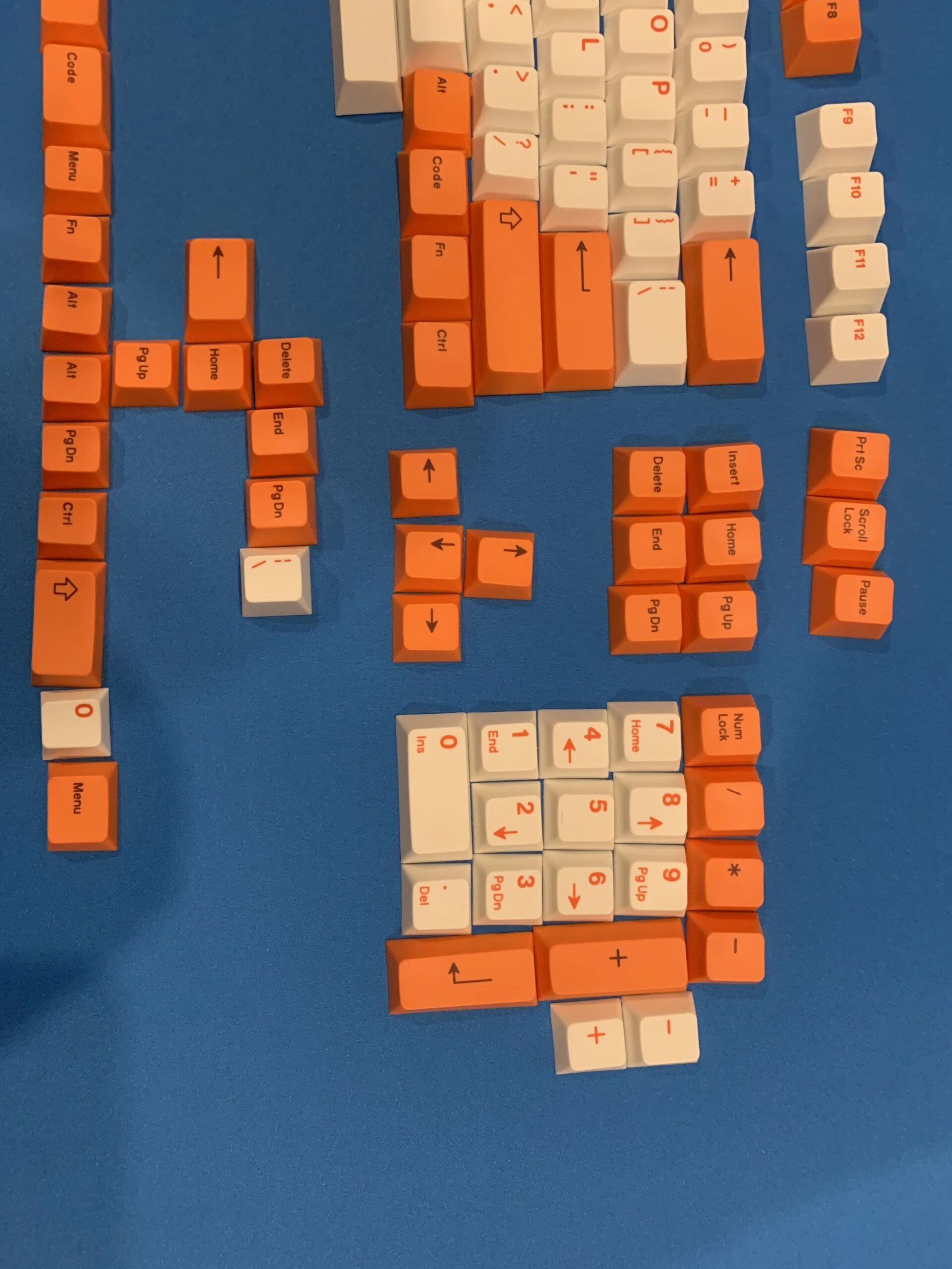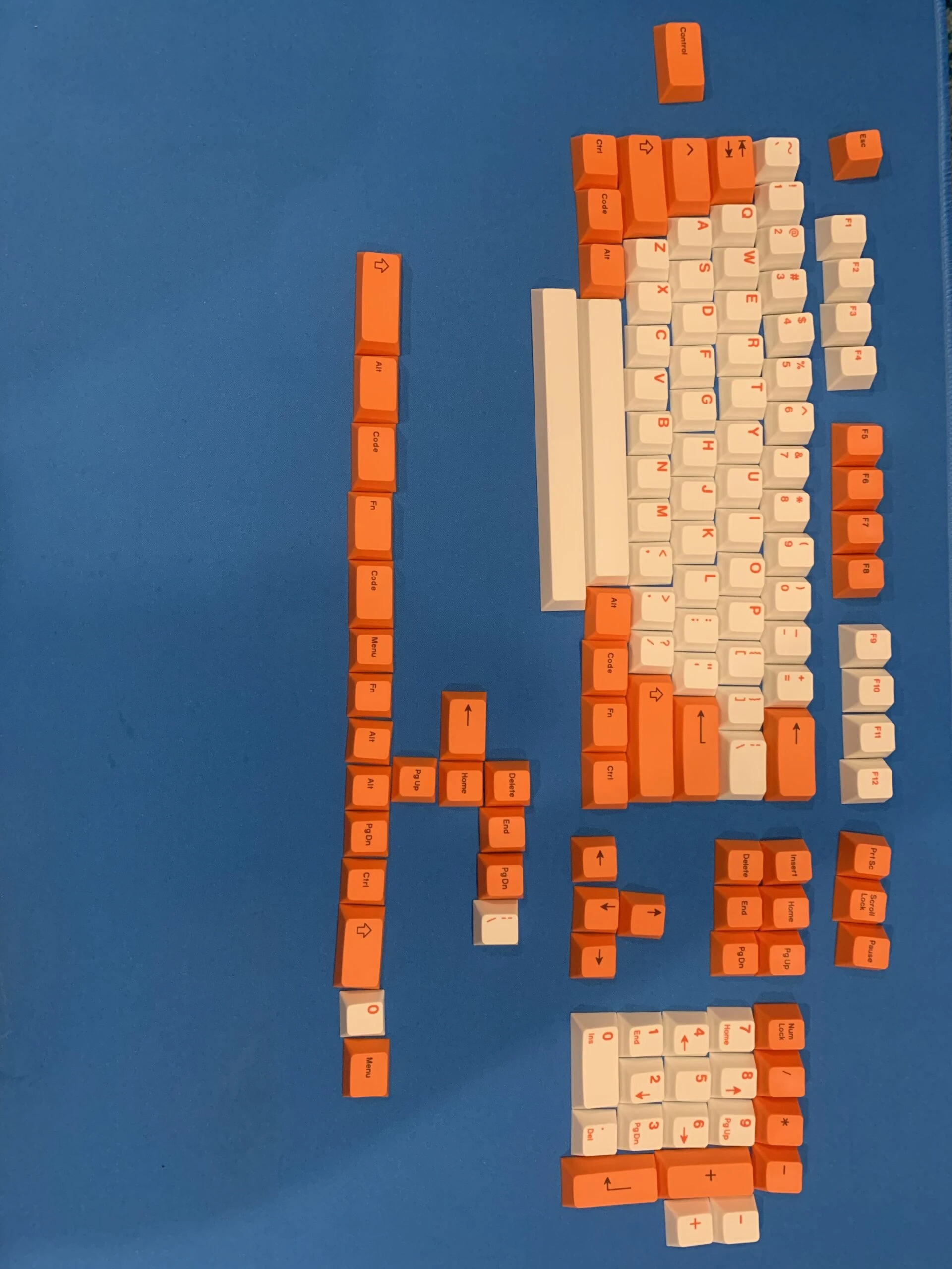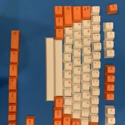 Orange and white keycap set from Drop, honestly a rather limited layout. Pictures below to check for compatibility. Keycaps are PBT, dye-subbed.