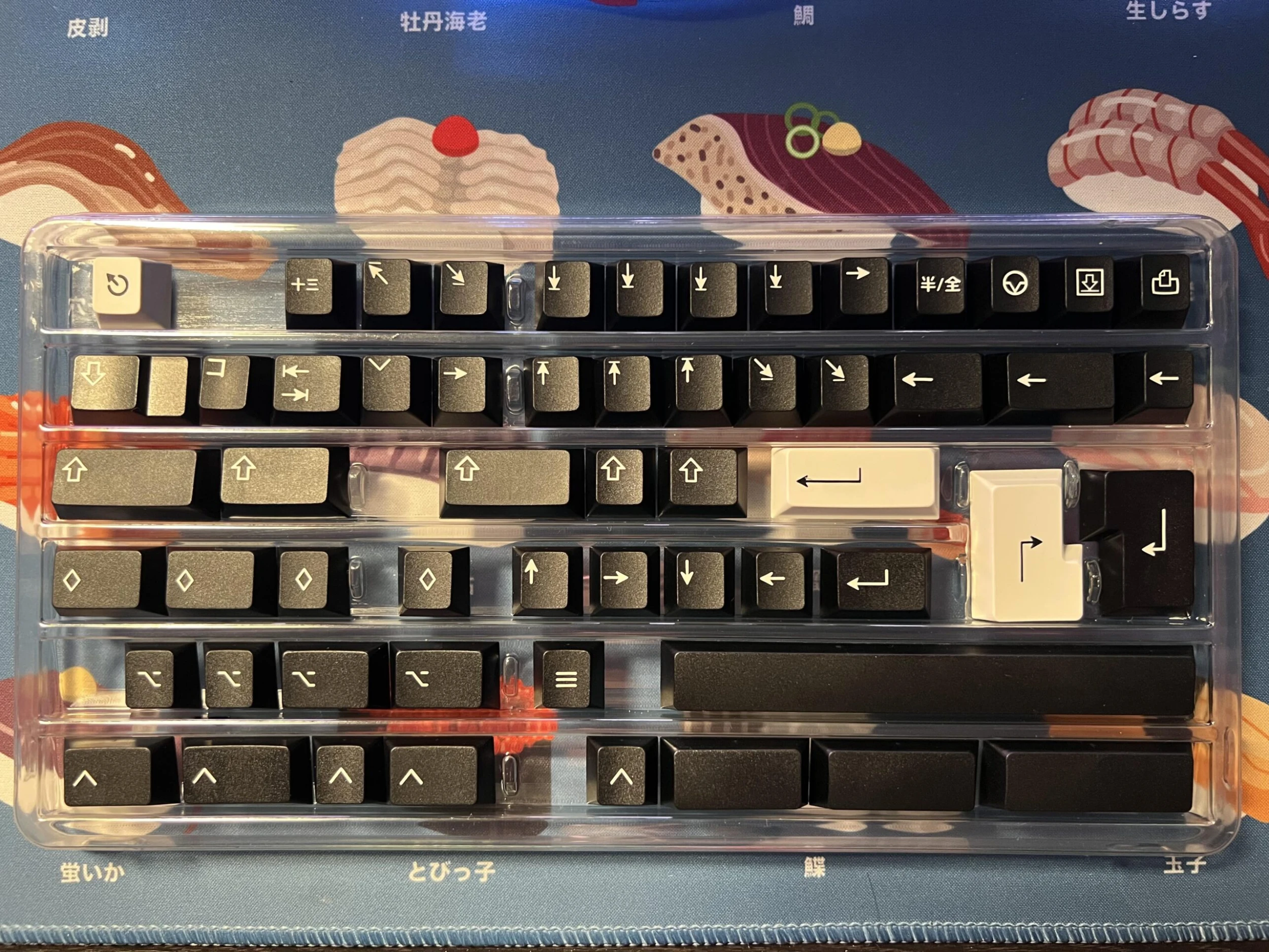 This is GMK WOB Katakana. No shine though it has been used so the price will reflect that but they are clean, never had any spills and all are in perfect condition. No caps have any issues staying on switches, never used the numpad, ISO or other alternative keys, mainly used on a 65%. Will come with these fancy EPBT trays to keep things organized but no original GMK box